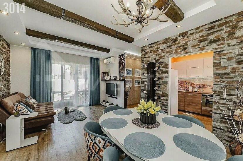 Кухня-гостиная совмещена, оснащена всей необходимой техникой и стильным интерьером.