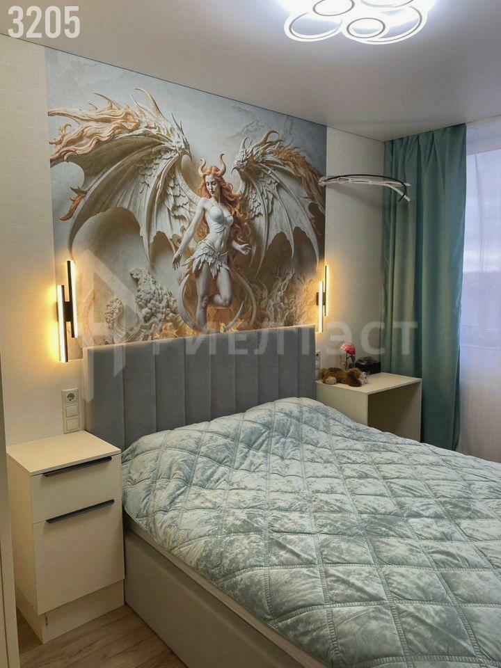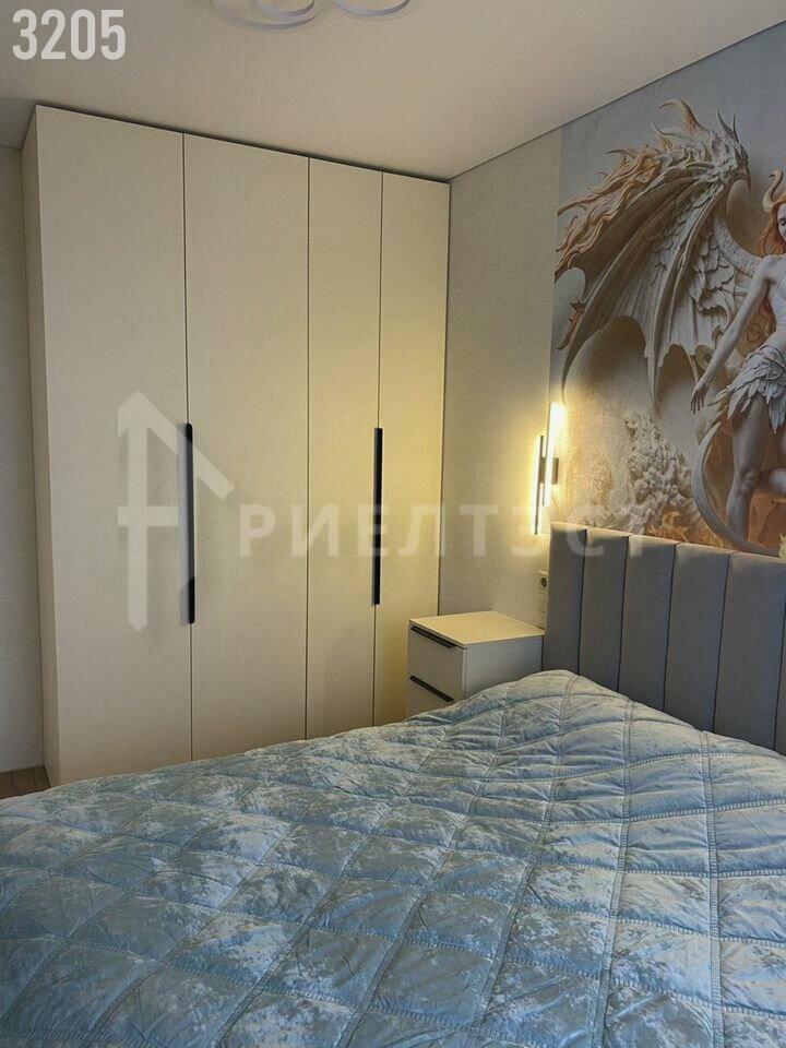 * Спальня: Установлен вместительный встроенный шкаф во всю стену, обеспечивающий максимум места для хранения. Стена у изголовья кровати украшена эффектным художественным барельефом, который придает интерьеру уникальность. Предусмотрено атмосферное прикроватное освещение.